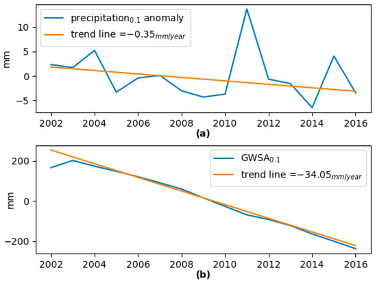 It is noteworthy that follows a sharp declining annual trend. Although the annual precipitation anomaly trend also decreases, the magnitude of the precipitation anomaly is quite small in comparison to that of groundwater storage changes (GWSC). In other words, one can say that the decreasing precipitation anomaly minimally contributes to the decreasing GWSA. This result is also consistent with other studies in this region that showed groundwater depletion, resulting from human withdrawals for agriculture, is a major cause for the sharp declining groundwater table [9,35].