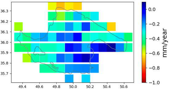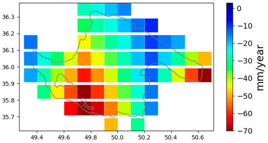 Figure 9 and Figure 10 show the yearly trend map for both . Figure 9 indicates the decreasing trend of (0~−70 mm annually) in the region during the study time period. follows a slight decreasing trend between 0 and −1 mm annually.
