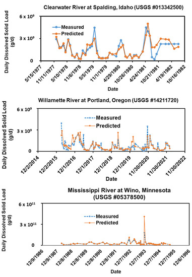 Predicted daily continuous sediment loads along with corresponding measured discharges for all six stations are shown in Figure 6 and Figure 7. The predicted peaks and valleys of the sediment loads had similar fluctuated patterns to those of the measured discharges for most stations excepted for Station #11447650 (Figure 6). That is, an increase in measured discharges increased the predicted sediment loads, whereas a decrease in the measured discharges decreased the predicted sediment loads. For example, the stream discharge increased from 810 m3/s on 1 May 1972 to 1421 m3/s on 17 May 1972 for Station #01358000 in Hudson River at Green Island, New York; whereas the predicted total solid load increased from 1.05 × 1010 to 1.85 × 1010 g/d for the same period and station. A 76% increase in discharge increased the predicted total solid load by about 75%. When the stream discharge decreased from 1421 m3/s on 17 May 1972 to 331 m3/s on 31 May 1972 at the same station, the predicted total solid load decreased from 1.85 × 1010 to 4.31 × 109 g/d. A 54% decrease in discharge decreased the predicted total solid load by 42%.