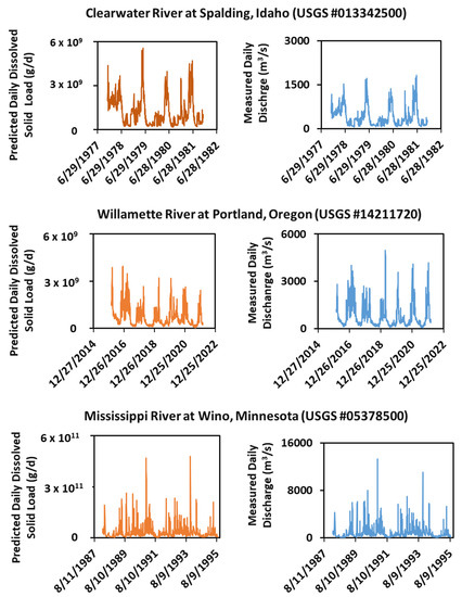 Predicted daily sediment loads and their corresponding measured daily discharges for Stations #013580003500, #02231000, and #11447650.