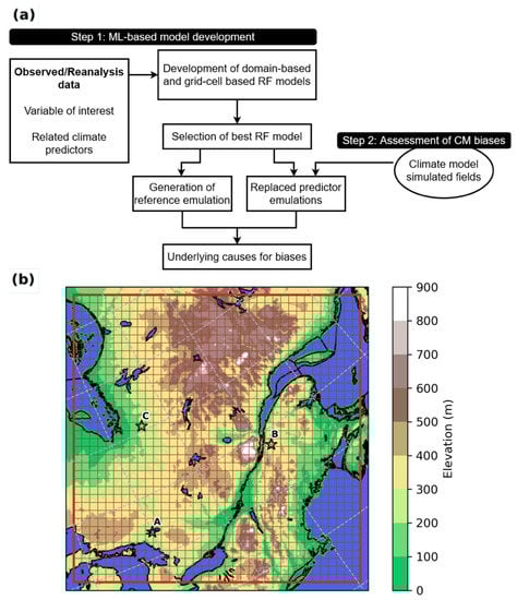 The proposed machine learning-based framework to identify mechanisms/variables responsible for biases in climate model simulated fields over a given region/domain is explained first in general terms, followed by its application for the cases considered in this study. As shown in Figure 1a, the framework consists of a two-step process. The first step involves the development of Random Forest (RF) models to emulate the variable of interest, i.e., the climate model simulated variable whose sources of biases need to be understood. To this end, observed gridded values of the variable of interest and climate predictors representing mechanisms that influence the variable of interest, along with geophysical fields (if required), need to be considered for training and validation. In the absence of gridded observed data, reanalysis products can be reasonable alternatives.
