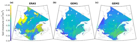 Mean surface soil moisture for the April–September period.(a) ERA5, (b) GEM1 and (c) GEM2. The former two are mean values for the 1989–2020 period while that for GEM2 is the mean for 1996.