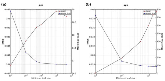 (a) Model performance for RF1, (b) RF2 (right) for different MLS values. Right-side axis indicates model file size; for RF2 this value corresponds to the sum of all models.