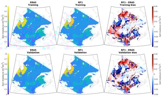 ERA5 (left column) and RF1 simulated (center column) SSM for training (top panel) and validation (bottom panel) periods and their biases (right column).