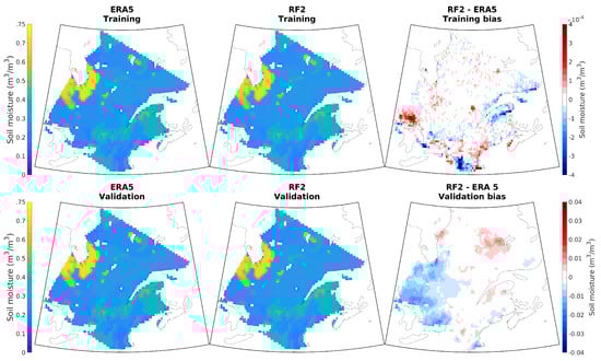 ERA5 (left column) and RF2 simulated (center column) SSM for training (top panel) and validation (bottom panel) periods and their biases (right column).