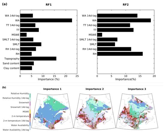 Mean surface soil moisture for the April–September period. (a) Relative importance of predictors for the RF1 model and average importance for the RF2 models. (b) Spatial view of the top 3 important variables for RF2. (WA: water availability; TT: 2 m temperature; MSWE: maximum snow water equivalent; SMLT: snowmelt; RH: relative humidity).
