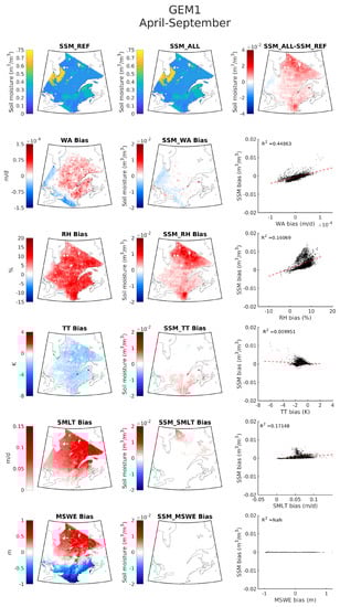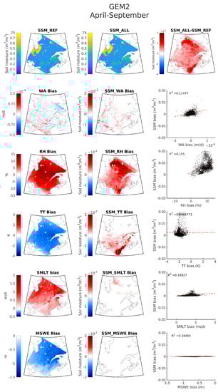 The last phase of the first step is to validate the RF models, for which six years of data are used. Results (bottom rows of Figure 4 and Figure 5) suggest good performance with coefficients of determination being 0.81 and 0.96, respectively, for RF1 and RF2. Given the better performance of RF2, this model is selected for the next step of the framework. The reference SSM for the next step, SSM_REF, is generated using RF2 for the April to September period for the 1989–2020 period, which is the GEM1 simulation period. As discussed in Section 2, the second step of the framework consists of SSM emulations using RF2, but replacing the SSM predictors from the ERA5 dataset with those from GEM (SSM_WA, SS_RH, SSM_TT, SSM_SMLT, SSM_MSWE, SSM_ALL) with the goal of understanding the source of SSM biases. This is undertaken for both GEM1 (normal) and GEM2 (perturbed) simulations. SSM_ALL is the emulation with all ERA5 predictors replaced with those from GEM. The comparison of emulated SSM for the replaced GEM predictors with that of SSM_REF aids in finding the contribution of biases in the predictors to SSM biases in GEM.