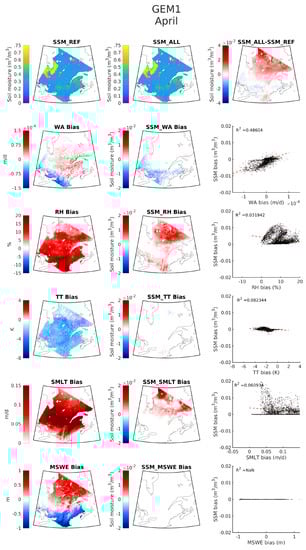 RF2 emulated SSM when using ERA5 predictors (top left panel), GEM1 predictors (top center panel) and their difference (top right panel) for the month of April in the 1989−2020 period. GEM1 predictor biases when compared with ERA5 (left column). SSM biases when replacing ERA5 climate predictors with those from GEM1 in RF2. Scatter plots of SSM bias against predictor bias are presented in the right column.