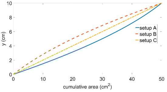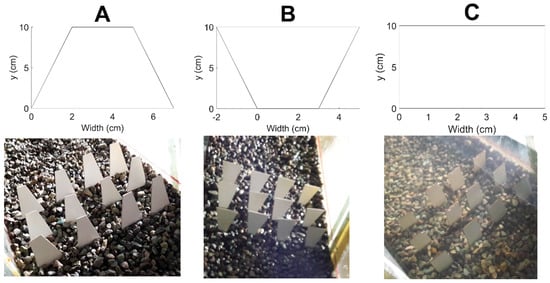 As can be seen in Figure 1, the width of the vegetation models varies linearly in the vertical direction for types A and B and it is constant for type C. The general form of linear functions is , where w is the width of the elements, and, a and b are constants that can be easily determined. The linear function of width variation in the vertical direction for type A is and for type B is . The cumulative frontal area of model vegetations can be obtained by integrating the width functions over vegetation height , which is 10 cm: