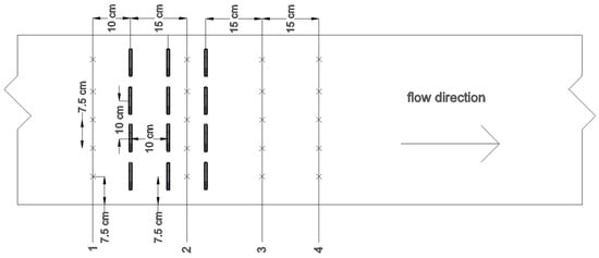 Plan sketch of vegetation elements and velocity profiles (X marks). The vertical lines (1, 2, 3, and 4) are the cross-sections.