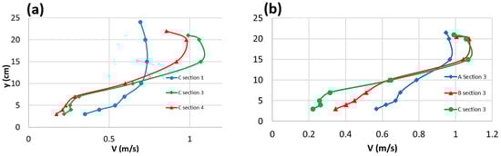 As mentioned before, eight points were measured in each velocity profile. The measured points were located at y = 3, 4, 5, 7, 10, 15, and 20 cm, and the water surface was different for each case. The velocity could not be measured in the vegetated region (from y = 0 to y = 10 cm of section 2) as it was impractical to do so with a propeller velocimeter. Figure 4a shows the velocity profiles of vegetation model type C (uniform distribution) in the middle of the channel (z = 22.5 cm). At the upstream (section 1), the velocity profile is similar to typical gravel bed velocity profiles but at 15 cm downstream of the vegetation patch (section 3), the velocity profile is altered drastically. The flow is retarded in the vegetated region (from y = 0 to y = 10 cm) and accelerated in the upper region (from y = 10 cm to the water surface), which is the typical velocity profile within submerged vegetation [,]. The flow is non-uniform and the depth of the water has decreased from 24 cm to 21 cm. The flow is recovering from vegetation effects in section 4 and it is showing signs of reverting to the profile from section 1.