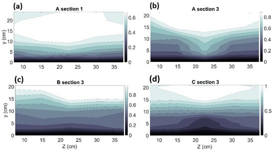 Figure 4b shows the section 3 velocity profiles of model vegetation A, B, and C in the middle of the channel. The velocity profiles are discernably impacted by the vertical distribution of density. Among the velocity profiles of the three vegetation models, model type A has a higher resemblance to the velocity profile upstream of the vegetation patch, meaning that it has suffered less of an impact in comparison to types B and C. Even though the density of model A is higher near the bed, the water has been able to flow easily within the vegetated region since the blockage in the upper part of model A is lower than in models B and C. As for models B and C, the difference in velocity between the vegetated region and the upper region is higher for them because they experience a higher blockage in the vegetated region and the flow, therefore, has been diverted to the upper region, causing a steeper water level gradient and a rapid rise of velocity at the upper region. This effect can also be seen from the velocity contours of the tests on the y-z plane (Figure 5). The velocity has risen rapidly in a short span in the upper region for vegetation type B, but it has risen more gradually for vegetation type A as model B causes more blockage at the top of the vegetation, whereas water has more freedom at the top of vegetation type A. For test A section 1, the velocity has been decreased at the water surface near the walls, indicating the occurrence of the dip phenomena near the walls. The first section of the three tests was nearly identical therefore only the first section of test A is plotted. The velocity contours cover from z = 7.5 cm to z = 37.5 cm in the z direction as the lateral velocity profiles were measured at 7.5 cm from the walls (Figure 3).