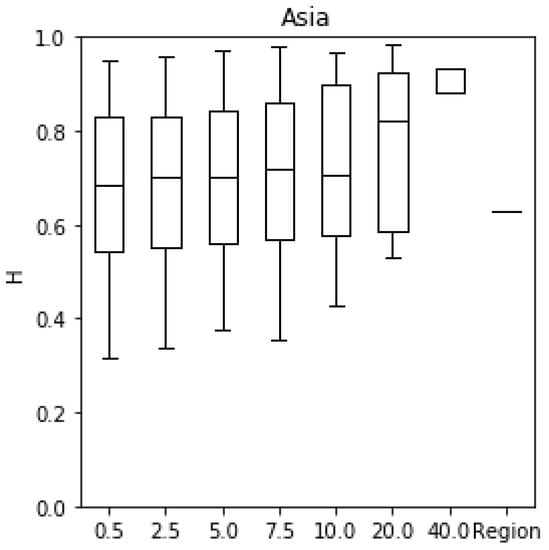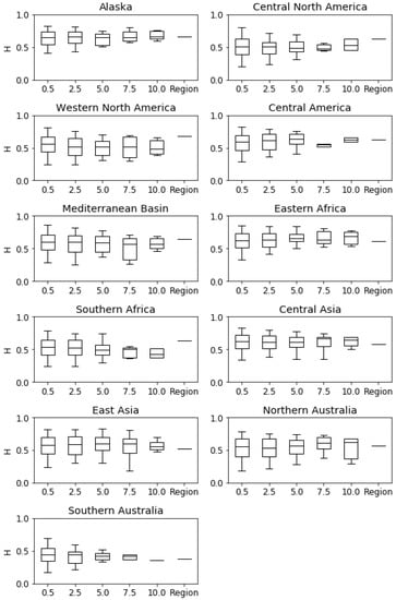 3.2. Spatial Scale Dependence of H for Average Annual Precipitation