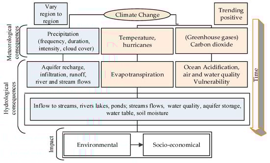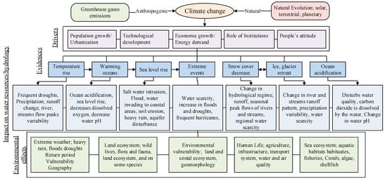 The objectives of this study are (1) to highlight the main driving forces behind climate change at a regional and global scale, (2) to describe the state-of-the-art methods to evaluate climate change and its impact on water and hydrologic regime, and (3) to describe the subsequent effects on water resources and the hydrological regime. A schematic design of the research is shown in Figure 1.