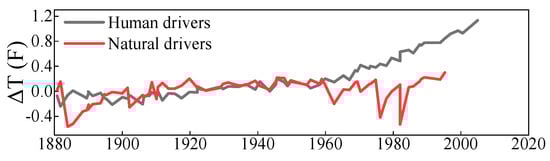 Climate change occurs through a complex set of interactive driving forces. According to the Intergovernmental Panel on Climate Change sixth assessment report (AR6; https://wg1.ipcc.ch/index.php/ar6/sixth-assessment-report-ar6; Accessed on 5 November 2022), human activity is the main driving force of climate change, whereas others contend that natural factors are also main causes. This ambiguity is due to inadequate data and methods to understand the phenomenon []. Both natural and human forces influence the Earth’s temperature, but the long-term trend observed over the last century can only be explained by the impact of human activities on the climate (Figure 2). Natural phenomena such as fluctuations in solar radiation and volcanic eruptions also have an impact on the Earth’s temperature. Similarly, Milankovitch cycles and El Niño Southern Oscillation (ENSO) are two other natural phenomena that are likely to change the Earth’s temperature. Milankovitch cycles occur as the Earth orbits the Sun, and its route and axis tilt might alter slightly. El Niño Southern Oscillation (ENSO) is a pattern of shifting Pacific Ocean water temperatures (https://www.metoffice.gov.uk/weather/climate-change/causes-of-climate-change; Accessed on 26 October 2022). However, they do not describe the warming we have experienced over the previous century. In this regard, the following four important human drivers are discussed in detail. These are also summarized in Table 1.