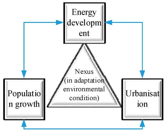 The human population increased from 1 billion to 7 billion in less than two centuries. Population growth has a direct relationship with the urbanization rate, and the growth of the urbanization rate in the past few decades is unprecedented. The two continents (Europe and Africa) are projected to be 56% and 64% urbanized, respectively, by the middle of this century [,]. In adaptation to environmental conditions, the nexus is shown in Figure 3.