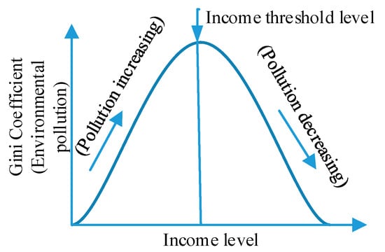 The nexus between economic development (GDP) and environmental sustainability has been long discussed. In particular, environmental objectives such as limiting global warming below a threshold (2 °C or 1.5 °C) have been challenging owing to continuous economic growth []. Industrial growth has recently negatively impacted the environment and increased GHG concentrations, toxic pollutants, and chemical spills []. Wu et al. [] hypothesized that income inequality and per capita income have an inverted U-shaped relationship. This indicates that the degree of environmental pollution increases as economic growth approaches the threshold income level and then declines at the same rate (Figure 5).