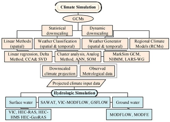 To assess the impact of climate on water resources and hydrology, it is necessary to first compute rainfall–runoff, analyze temperature variations, compute population increases within the basin, and then statistically evaluate the results [,]. Progressive downscaling approaches that can be used on the temporal and spatial aspects of climate have been used for projected climate scenarios. Statistical downscaling models are relatively computationally effective and have been applied on a large scale to determine the impacts of regional climate change, particularly in hydrological response evaluations []. Trzaska and Schnarr [] categorized statistical approaches as linear methods (canonical correlation analysis), weather classifications (artificial neural network), and weather generators (non-homogeneous hidden Markov model (NHMM)). A conceptual methodological framework is shown in Figure 7.