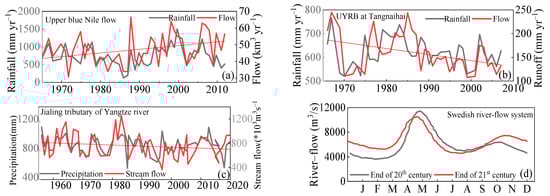 The impact of climate change on river-flow systems varies from region to region. The upper Blue Nile shows positive trends in the 30-year moving averages of the mean and standard deviation of annual river flow and annual rainfall (Figure 9a) []. Conversely, the Tangnaihai tributary of the upper Yellow River basin (UYRB) shows a significant decrease in a runoff with the rate of −11.6 mm/decade (Figure 9b) [], and Jialing tributary of the Yangtze River basin shows a negative trend in average annual streamflow with a change rate of 1572.3 (m3/s)/a (Figure 9c) []. Similarly, the flow peak (mean annual maximum flow) was found to be lowered by 15% across Sweden, and the annual redistribution of overall river flow to the sea accounts for 19% on average. Surprisingly, the same changing pattern is shown for the projected climate of the same region (Figure 9d) [].