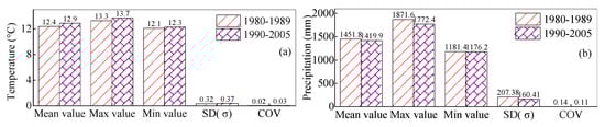 Zhang et al. [] determined that temperatures would be higher in the 2080s than in the 2040s on seasonal and monthly timescales. The largest median would increase by 1.6 °C by November 2040 and 3.8 °C by September 2080 for maximum monthly temperatures. In contrast, the lowest median temperature increase would be 1.1 °C by March 2040 and 2.5 °C by February 2080. On a seasonal scale, temperatures are likely to increase (a median increase of 1.5 °C by 2040 and 3.4 °C by 2080) in spring for both periods. Meanwhile, these are likely to decrease in the autumn of 2040 (1.3 °C) and summer of 2080 (2.9 °C). In addition, the projected largest runoff (monthly) is likely to shift from March to February compared with the baseline. The projected maximum monthly increase in runoff would be 6.9% in November 2040 and 31.1% in February 2080. Meanwhile, the maximum monthly decrease would be −16.7% in June 2040 and −205% in July 2080. Figure 11 illustrates the variability of hydrological and climatological variables in the Manning River basin.