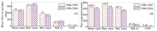 Statistics for (a) annual temperature (T), (b) precipitation (P), (c) and streamflow in wet season in the Qingyi river basin and (d) evaporation at Pengshan meteorological station for different scenarios (Data source; []).