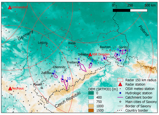 An overview of the study region, Saxony, Germany (WGS-84 Pseudo-Mercator projection), with a background of a digital elevation model (DEM) based on SRTM30. Presented are also radar stations of DWD, recording meteorological station from OSW and the ten selected catchments. The ID numbers of the catchments here match those in Table 1.