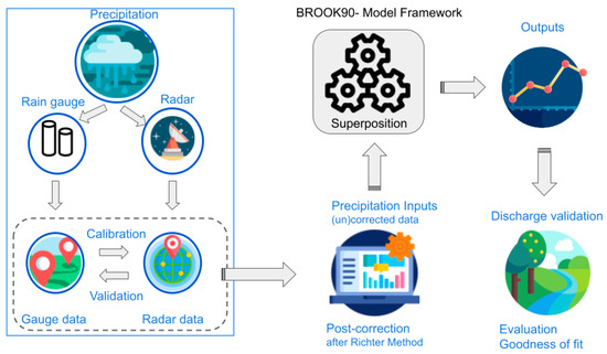 Accurate precipitation data is a crucial component in simulating the water balance and hydrologic behavior at catchment scale [1,2]. Many studies have demonstrated that the timing and peak of the simulated response were significantly affected by the spatial resolution of precipitation input to the model [3,4,5]. Rain gauge precipitation data are still referred to as a state-of-the-art data source and are an important input to hydrologic models. The accuracy of flood estimates depends largely on the density of the rain gauge network and the accuracy of the instruments [6,7]. To estimate rainfall over an entire catchment, the point measurements of rain gauges have to be interpolated. As a result, they are limited in their spatial and temporal representation of precipitation [8,9,10]. Inversely, real-time precipitation radar over a large region can provide spatially and temporally high-resolution estimates of precipitation intensity; thus, it is gaining attention in many hydrological and meteorological applications [8,11,12]. However, most applications of radar quantitative precipitation estimate (QPE) are limited to flood or surface water management, and considered typically only for short periods of hours or days or around a flood event [13,14]. Hence, the advantages and possible disadvantages related to long-term radar QPE in water balance modeling, particularly the distinction between accumulated and continuous methods of measuring precipitation, are rather still sparsely considered in scientific research.