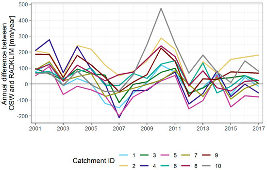 The annual precipitation products derived from OSW and RADKLIM data without the correction for the ten catchments were compared over the 2001–2017 period. Figure 6 shows generally no clear pattern in differences between the two datasets for the selected catchments. Precipitation from gauges can be higher or lower than precipitation from radar and varies from year to year and from catchment to catchment. It can be noted that the deviation was lower for the dry years (e.g., 2003, 2014) compared to the wet years (e.g., 2010), which is probably a result of the small number of selected catchments or uncertainties in precipitation in the datasets obtained from radar beams and extreme events [16,17]. The absolute difference ranges between 100 and 200 mm. Previous studies showed that the QPE radar precipitation show underestimations compared to precipitation from rain gauges [17,25], particularly in mountainous regions where radar beams are often blocked by orography. This effect can be clearly observed in the Tannenberg catchment (ID 10, 662 m.a.s.l.) in 2010, which is considered as a “wet year” with large precipitation sums. Here, the difference between gauges and radar reached the maximum values of over 400 mm on an annual scale. Moreover, the positive bias for the median values of the ten catchments (Table 3) was statistically significant at a daily scale, suggesting that precipitation from gauges is generally higher than from radar. This finding was also confirmed by the study of Kreklow et al. (2019), in which different precipitation datasets were compared in high resolution for the entire Germany. However, precipitation sums from radar were found higher than gauges at the catchment 1, 4, and 5 on a monthly scale and at the catchment 5 on an annual scale. This negative bias was, nevertheless, statistically insignificant (Table 3). Thus, it suggests that the difference of the two precipitation datasets can be arbitrary.