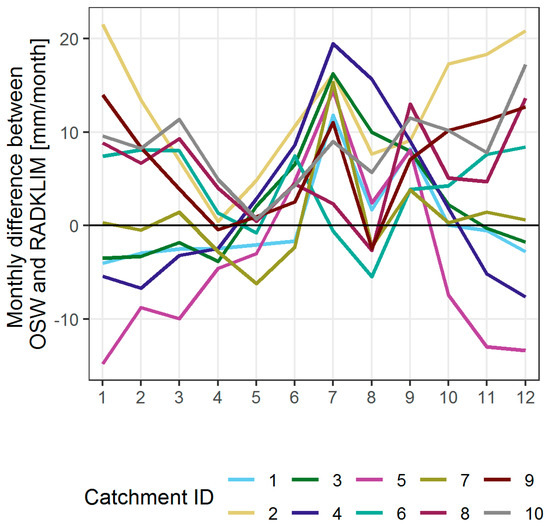The average differences of monthly precipitations from OSW and RADKLIM for the ten selected catchments in the study period (2001–2017).