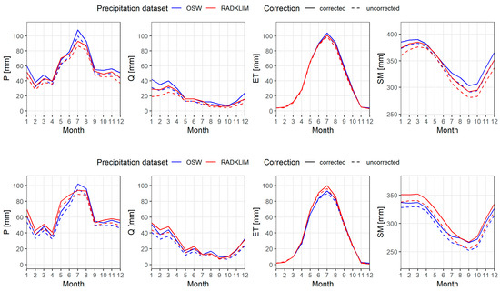 The difference between the two precipitation products, in particular their distribution during the year, leads to different impacts to simulated water balance components. Figure 9 shows two examples with the contrast that in one case the precipitation from rain gauges is larger than the precipitation from the radar (Holtendorf catchment) and in another case vice versa (Niederoderwitz). The model outputs with uncorrected precipitation serve as an uncertainty range when the correction process is not considered. In general, the higher precipitation amount, the more discharge, evapotranspiration, and soil moisture is generated. However, this is more evident for discharge (winter months) and soil moisture (summer months) than for evapotranspiration. This can be explained by the limitation of energy input despite the availability of water in the sites and saturated soil in the winter. As shown in the previous section, rain gauges tend to record more precipitation (10–20 mm monthly average) in the summer months (June–August) than radar, which has a greater impact on ET and soil moisture than discharge. Climatologically, low discharge is typical in the study sites due to the high rate of evapotranspiration and large soil retention capacity. Thus, the difference in precipitation between the two products is reflected in the change in soil moisture and ET if energy input is present. A quantitative assessment, however, can be made only for discharge (see in next sections) due to the availability of measurements. The limitations of soil moisture and ET measurements at the catchment scale leave the comparison at the visual level and physical plausibility.