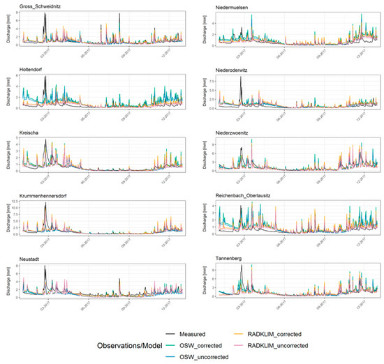 Exemplarily results of simulated (weighted mean from all HRUs) runoff derived from four different precipitation datasets (OSW uncorrected, OSW corrected, RADKLIM uncorrected, and RADKLIM corrected) compared to the observations for the ten selected catchments, exemplary for 2017.