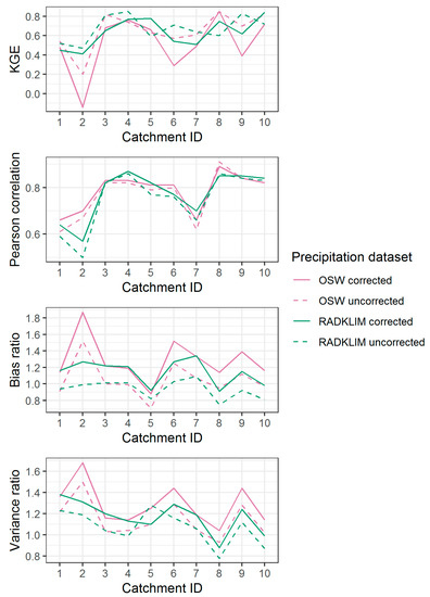The primary advantage of the KGE criteria is the ability to obtain a deeper understanding of model uncertainty through its decomposition. A closer look at the KGE components (Figure 10) shows that correlation coefficients for the catchments are high (r > 0.8), with the exception of the catchment IDs 1, 2, and 7, and the main problems were found in overestimations of the mean (bias ratio > 1 and variance ratio > 1) (except for simulations with radar at the catchments 8 and 10). Overall, we found that neither RADKLIM nor OSW data performs better than the other. While the model with RADKLIM data performed better in Holtendorf, Neustat, Niedermuelsen, Reichenbach Oberlausitz, and Tannenberg (IDs 2, 5, 6, 9, and 10, respectively), the model with gauge precipitation performed better in Großschweidnitz, Kreischa, and Niederzwoenitz (IDs 1, 3, and 8, respectively). However, an interesting result can be seen at the Tannenberg catchment, where the quality of the radar-derived precipitation was found to be poor due to beam blockages [25], yet still resulted in reliable performance (KGE > 0.7).