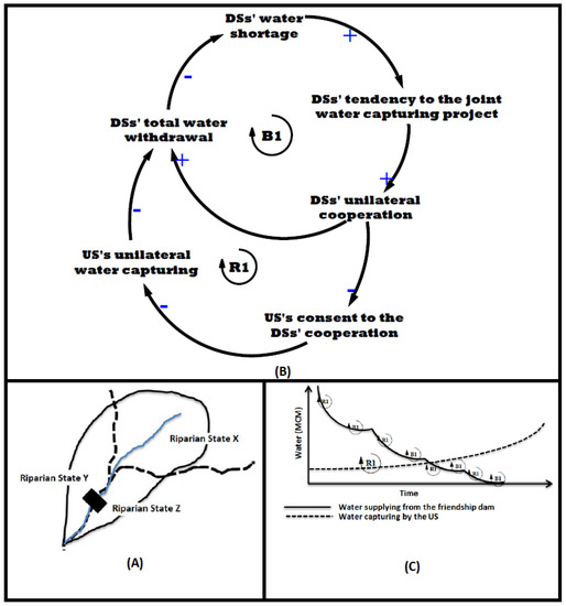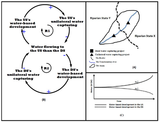 This HSA is patterned on a well-known SA titled “success to the successful” consisting of two reinforcing loops interacting against each other [24,40]. As more success for one brings more failure for the other, the result is rapidly skewed toward the more successful side. It fits a simple TB consisting of a transboundary river originating from an upstream state (US) and flowing toward a downstream state (DS) (Figure 1A). The US enjoys being dominant on the most natural water discharge, which typically occurs at the primary tributaries of each TB. Any water captured by it directly results in a decrease in the DS’s water flow. This property is the primary hydrological and political feature that provides the environment embracing this HSA. In addition, both riparian states rely on the transboundary river’s water, and they can catch the entire water streaming into their soils immediately or later (Appendix A, Table A1).