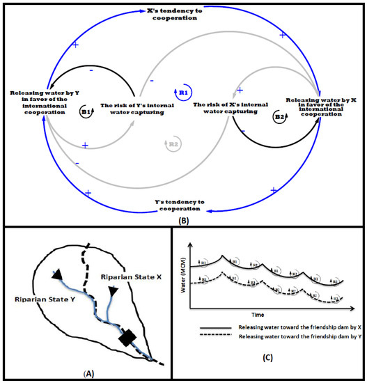 The appropriate environment to host this HSA represents the area where transboundary rivers form part of the borders between riparian states (Figure 2A). At the same time, they both dominate the river’s tributaries in terms of water capture and can control the same amount of natural flow. Furthermore, international borders may be a suitable place for a joint water-capturing project, such as a common dam, called the “friendship dam” in the literature [43,44,45], which serves various purposes, such as hydropower, agriculture, domestic water, and so on (Figure 2A).