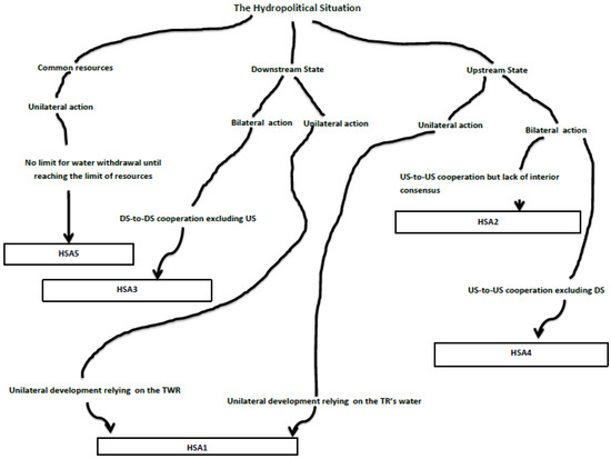 To understand the potential hydropolitical situation, a cognitive map is sketched in Figure 6 to simplify the HSA analogy. The figure allows us to look at the hydropolitical situation by tracing the actions of riparian states back to potential HSAs. This simplified tool highlights the critical human HDs that underlie each HSA.