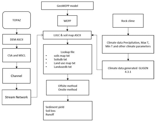 This research employs the GeoWEPP model for the estimation of runoff, soil loss, and sediment yield in the studied watershed. The main input data for the model are the digital elevation model (DEM), the land use land cover map (LULC), the soil map, and climate data. The three raster maps of the soil, DEM, and LULC are prepared in rectangular shapes containing the studied watershed with the same grid size of 30 m × 30 m using ArcGIS 10.2 and then converted to the American Standard Code for Information Interchange (ASCII) file format to feed them the model. For the methodology flow chart, see Figure 2.