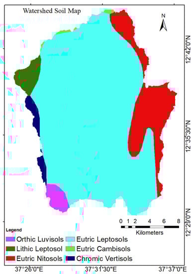 There are six types of soils within the Megech dam watershed as data collected by the Ministry of Waters and Energy (MoWE). Soils type coverage, according to ArcGIS zonal geometric analysis, can be stated as eutric leptosols (78.94%), and eutric nitisols (14.00%) covering more than 90%, lithic leptosol (2.71%), orthic luvisols (2.02%), chromic vertisols (1.91%), and eutric cambisols (0.43%) (See Figure 4).