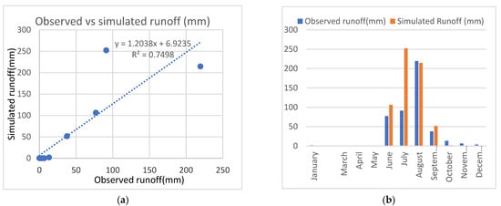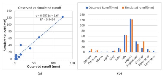 Model validation runoff (2003–2004). (a) Observed versus simulated runoff; (b) Mean monthly observed and simulated runoff depths.