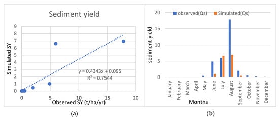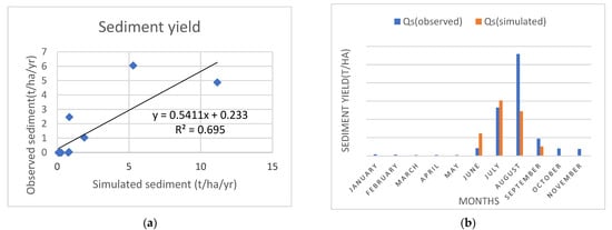 Calibration period (2000–2002). (a) Observed versus simulated sediment yield, and (b) Monthly sediment yield.