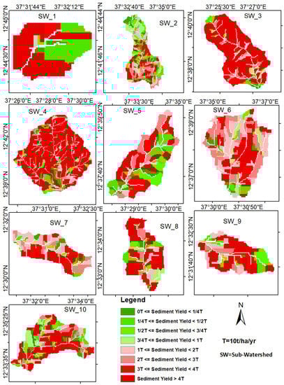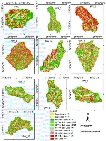 The map of the GeoWEPP onsite model simulation results varied from a deep green to a light green map is designated within the tolerable limit, whereas from light red to deep red colors are soil erosion areas above the tolerable limit. In the case of local sediment deposition rate, deep- and light-yellow colors are for above and below the tolerable limit value, respectively. In Figure 9, model maps can illustrate the spatial distribution of soil erosion and deposition rates for the selected ten sub-watersheds in order to identify hot spot erosion areas for watershed management [,].