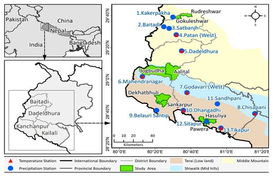 Most studies comparing the farmers’ perception with instrumental observation have focused on smaller geographical areas. Very few studies have compared people’s perceptions with scientific data covering multiple ecological regions. Such comparative studies are very rare in the Far-western region of Nepal (See, for example, [,,]). To the best of our knowledge, this study is the first to compare farmers’ perceptions in different ecological regions of Far-western Nepal with scientific data. This study compares farmers’ perceptions of climate change and historical hydroclimatic observation in three different physiographic regions of Far-western Nepal. The objectives of the study are to (i) analyze temporal trends in historical temperature and precipitation observations, (ii) assess farmers’ perception of changes in temperature and precipitation, and compare their perception with the observed hydroclimatic trends, and (iii) examine the perceived impacts of climate change on agriculture. Farmers’ perceptions about hydroclimatic trends and impacts of climate change were gathered through the questionnaire survey and focus group discussions (FGDs). The insights gained from this study contribute to advancing our fundamental understanding of the impacts of climate change on agricultural practices (such as farming patterns, crop yield, mitigation, and adaptation strategies) in the Himalayan region that, in turn, could help to inform the design of adaptation and mitigation strategies.