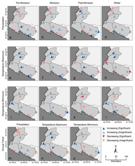 Temperature and precipitation datasets were acquired from the Department of Hydrology and Meteorology (DHM), Nepal. We assessed annual and seasonal trends for the period 1970–2014. The seasonal trends were assessed for Pre-monsoon (March–May), Monsoon (June–September), Post-monsoon (October–November), and Winter season (December–February). We evaluated the monotonic trends at each station using non-parametric rank-based Mann–Kendall tests [,]. The trend magnitude was estimated using Theil-Sen’s approach [,]. The Mann–Kendall test is robust against data gaps and outliers, and the method is widely used in such hydroclimatic analyses. We show the trends at a 5% level of significance.