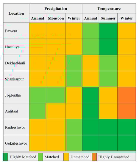 Farmers’ perception of temperature aligned more than that of precipitation (Figure 4). Perception of annual and summer temperatures coincided more than that of winter temperatures with observed trends. There is a spatial variation in temperature perception. Highly converging perceptions with the observed temperature trend are seen in the middle mountain and mid-hills (siwaliks) regions compared to lowland Terai. Only two locations, Jogbuda and Aalital of mid hills region, represent a highly unmatched perception of winter temperature trends.