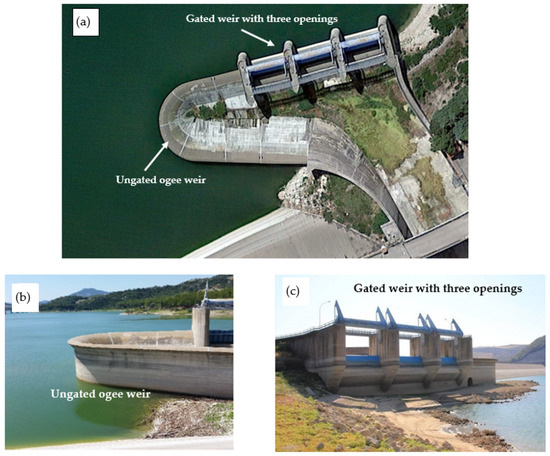 The dam surface spillway consists of an ungated ogee weir, 92 m long with a crest elevation at 125.5 m a.s.l. (Figure 2a; detailed view in Figure 2b) and a gated weir with three 13 m wide openings, equipped with automatic flap gates with counterweights pivoted at the sill (Figure 2a; detailed view in Figure 2c). The gate configurations are either open (minimum elevation of 122.0 m a.s.l.) or closed, sharing the same elevation as the ogee weir (i.e., 125.5 m a.s.l.). The gate drop takes place automatically and progressively as soon as the reservoir water level reaches an elevation of 125.5 m a.s.l.