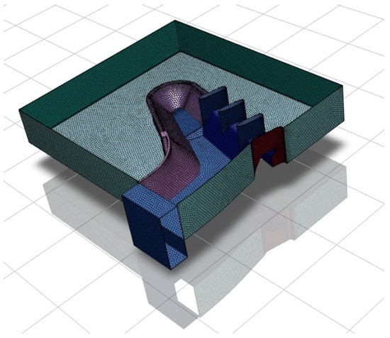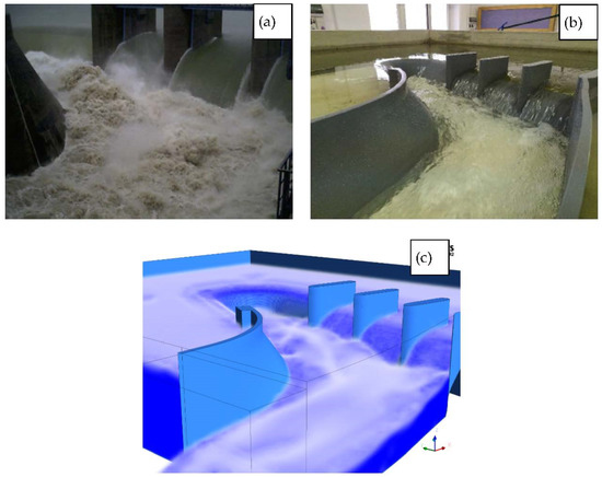 All these processes are sensitive to the complex three-dimensional flow effects involved in dam hydrodynamics. To accurately study the hydrodynamics and the fluid–structure interaction issues, Computational Fluid Dynamics (CFD) numerical tests together with experimental models are considered within the present research study as mandatory tools (as shown by [2,3]). CFD solves the governing equations of fluid-flow problems, i.e., the continuity, the Navier–Stokes and the energy equations. Because of the nonlinear terms in these equations, analytical methods yield very few solutions. Then, numerical methods, i.e., CFD, are used to obtain the required solutions. Numerical models prescribe the discretization of the domain. The continuous spatial and temporal domain of the problem must be replaced by a discrete one made up of grid points or cells and time levels. The governing equations of the problem must be replaced by a set of algebraic equations with the grid points/cells and the time levels as their domain. Finally, the solutions at each grid point/cell are obtained when advancing from one time level to the next. Conversely, a physical model consists of the “physical” reproduction of a scaled artifact and the phenomena that occur in it. Experimental tests performed on physical models provide useful information on the entity and behavior of the variables involved in the phenomena under investigation in a controlled environment. In general, those quantities may be measured in a limited number of points within the domain.