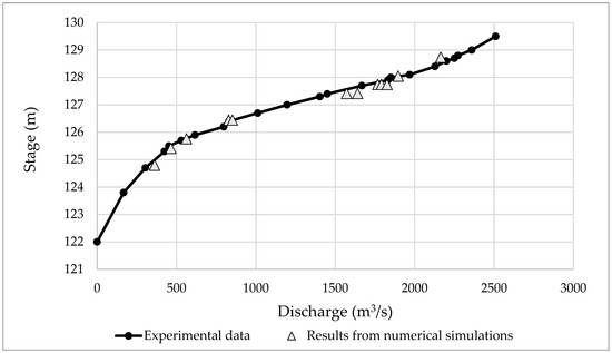 In order to quantitatively check the reliability of the numerical model, the discharge computed for each model (and the corresponding water stage employed as the inlet boundary condition) was compared to that employed within the experimental investigation. The experimental procedure consisted in varying the discharge flowing through the model and contextually measuring the water level within the upstream tank that reproduces the modeled Lake Guardialfiera. Eighteen experiments were run with different values of the discharge. The experimentally obtained stage–discharge rate curve was then compared to that one used at the dam design stage and validated. The comparison was satisfactory as the maximum error was roughly equal to 3% (refer to [19] for the complete procedure employed to construct the experimental rating curve).
