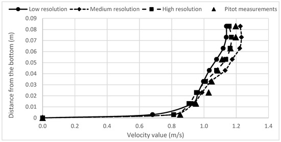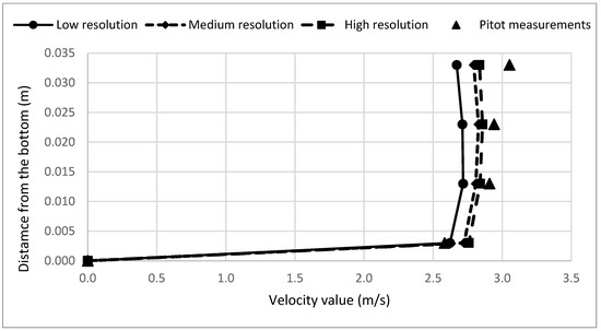 Figure 14 presents the comparison between the velocity profiles reconstructed with Model #2 at three different resolutions and the Pitot measurements at location 0.14 m upstream the chute, within the surface spillway volume. No remarkable differences can be noted for the different resolutions adopted for the simulations. Conversely, Figure 15 which presents the same comparison at a location of 1.639 m downstream from the chute suggests that higher resolution is required for a better match. For this reason, further simulations were conducted, employing the higher resolution.