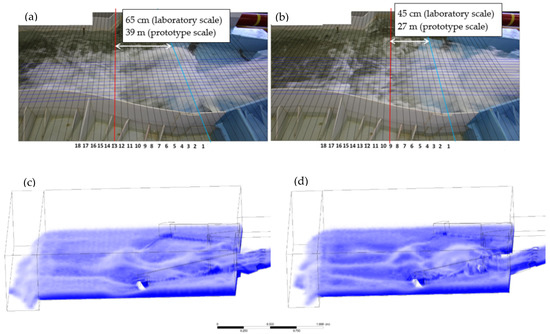 Hydrodynamics in the stilling basin and the riverbed downstream from the lateral view for a discharge value of 1650 m3/s and (a) ski-jump-like sill in place (c) is the output of the numerical model); and (b) ski-jump-like sill removed (d) is the output of the numerical model).
