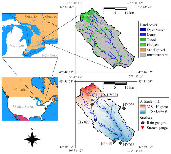 The densely occupied Don River basin (Toronto, ON, Canada) houses approximately 1.4 million residents in total area of nearly 350 km2 upstream the river gauge HY019 (Figure 1), where the average baseflow is estimated to be in the order of 5 m3/s. The longest flow path has 38 km length and an average slope of 6.6 × 10−3, which reflects the overall smoothness of the relief in the surroundings of the Great Lakes.