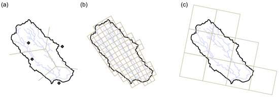 Figure 2. Spatial granularity (before aggregation) of the data precipitation products from (a) rain gauges’ Thiessen polygons, (b) ground-based weather radar’s derived N1P product grid cells, and (c) NWM product grid cells.